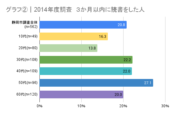 グラフ②③を比較すると、大きく目立つのが30代の減少です。2014年には22.2%が「3か月以内に読書をした」と回答したのに対し、2024年調査では7.5%まで減少しています。また、同じく減少傾向にあるのが50代で、こちらも2014年と比較すると10ポイント近く減少しています。
