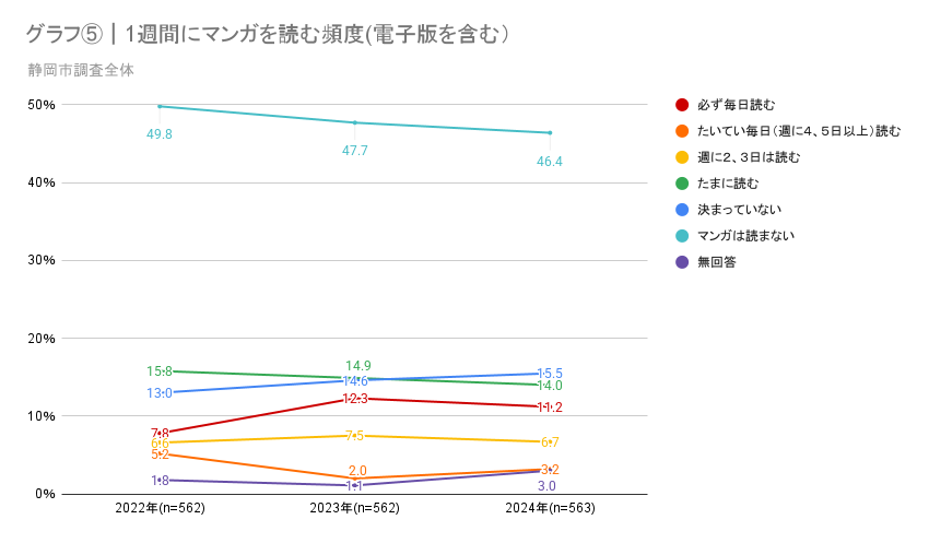 ちなみに、先ほどのグラフはマンガを含んでいませんが、「1週間にマンガを読む頻度」について経年の変化を見たのがグラフ⑤です。こちらは2022年からの調査項目のため、3年間の比較を見てみました。