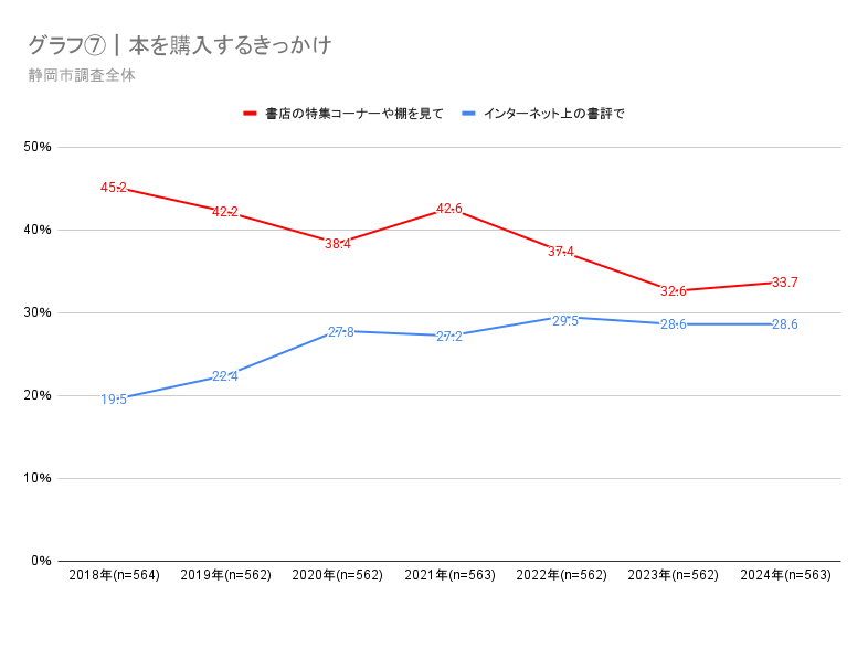 グラフ⑦を見ると、「書店の特集コーナーや棚を見て」のピークが2018年の45.2%に対し、2024年では33.7%と10ポイント近く減少しています。とはいえ、「インターネット上の書評で」と比べると、いずれの年も数字は上回っているため、まだまだ書店をきっかけに購入する人は多いようです。