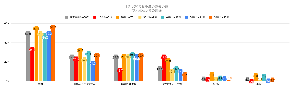 グラフ①は年代別お小遣いの使い道について、「ファッション」に関する項目のみを抜粋したものです。