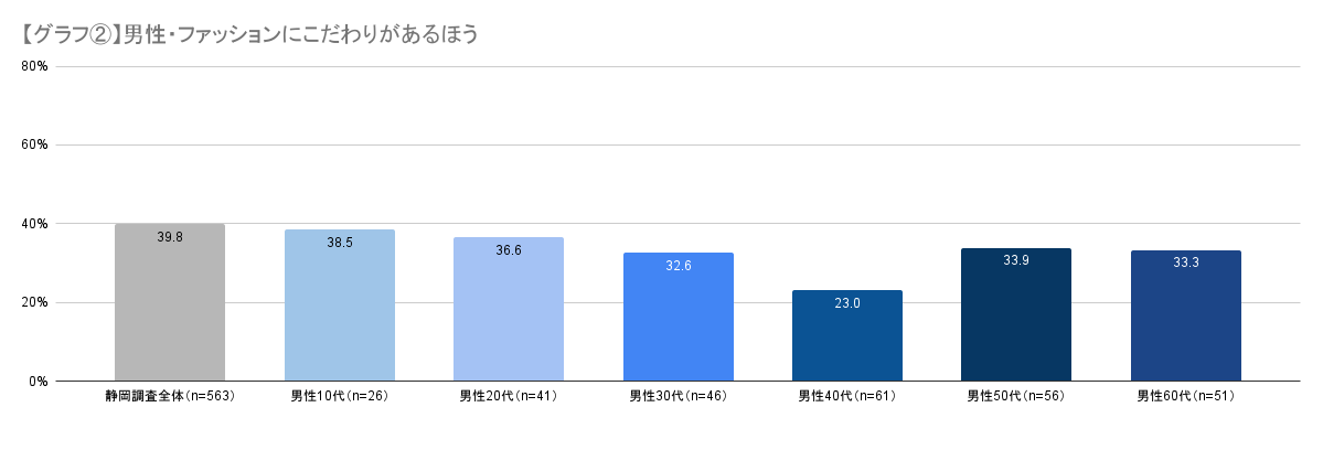 グラフ②を見ると、男性は10代が最もファッションへのこだわりがあり、20代から徐々に減少をはじめ、40代では23.0%と最も低い数値となりました。その後、男性50代・60代では再び33%台へと回復しています。
