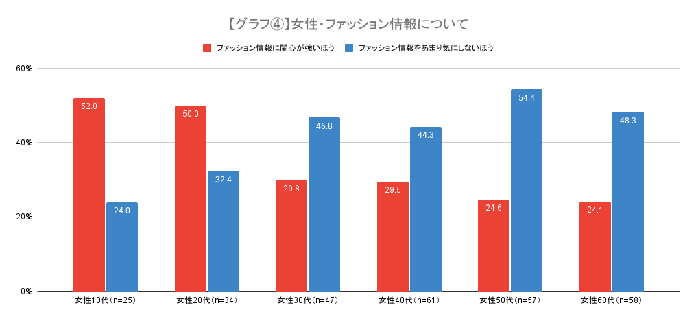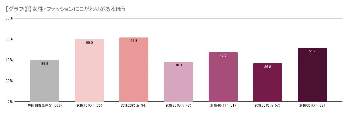 一方で、女性の60代では再び数値が伸びて51.7%まで回復。半数以上がファッションにこだわりがあるということがわかります。また、グラフ②③で同世代の男女を見比べると、どの世代も男性よりも女性の方が数値が大きく、ファッションへのこだわりが強いと考えられます。