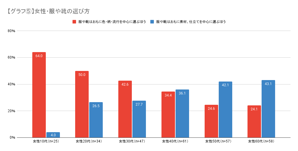 続いて、服や靴の選び方を比較したものがグラフ⑤です。こちらも年代が高くなるほど「素材、仕立てを中心に選ぶほう」が増加し、「色・柄・流行を中心に選ぶほう」が減少傾向にあります。「素材、仕立てを中心に選ぶほう」が「色・柄・流行を中心に選ぶほう」を上回るようになったのは40代でした。