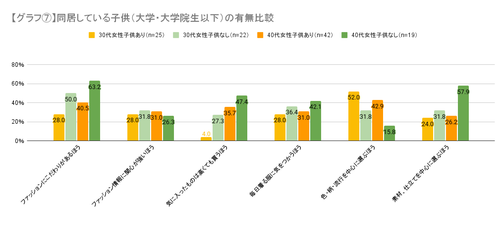 グラフ④~⑥を見ると、女性30代~50代という子育て世代で価値観に変化があることがわかります。そこで、同居している子供(大学・大学院生以下)がいる女性といない女性のファッションへの価値観比較を行いました。そのグラフが⑦です。