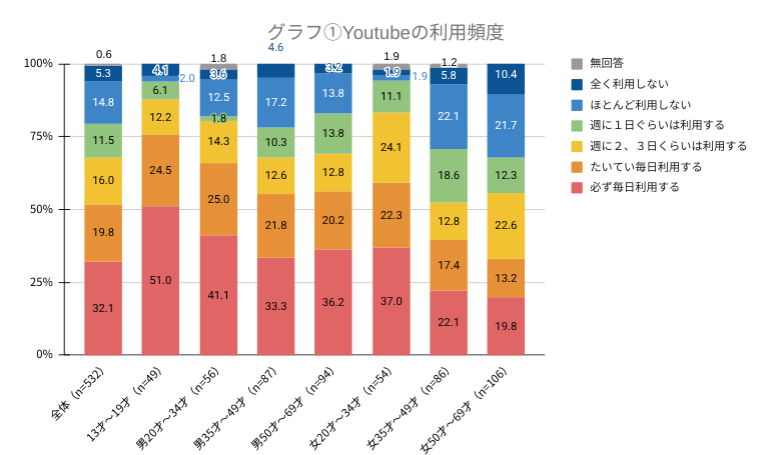 静岡市調査全体では「必ず毎日利用する」32.1%、「たいてい毎日利用する」19.8%となり、50%以上の方がほぼ毎日YouTubeを利用しているようです。また、10代と女性20~34歳では「ほとんど利用しない」「全く利用しない」と回答した人の合計が10%以下と非常に低く、9割以上の人が週に1日以上YouTubeを利用しているようです。