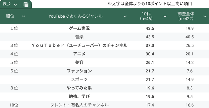 性年代別で見ると、10代では「ゲーム実況」「音楽」43.5%が最も高く、次いで「YouTuberのチャンネル」37.0%でした。「ゲーム実況」「YouTuberのチャンネル」「アニメ」「美容」「ファッション」「やってみた系」「勉強、学び」は調査全体よりも10%以上高く、娯楽や趣味のジャンルや学生ならではの「勉強」という項目が高いことがわかります。