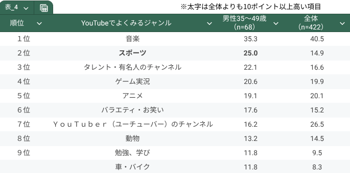 男性35~49歳では、「音楽」35.3%、「スポーツ」25.0%、「タレント・有名人のチャンネル」22.1%が上位にランクインしました。10代や男性20~34歳では「タレント・有名人のチャンネル」よりも「YouTuberのチャンネル」が上位に入っていましたが、男性35~49歳では「タレント・有名人のチャンネル」が上位に入りました。また、9位には「勉強、学び」の項目がランクインしています。
