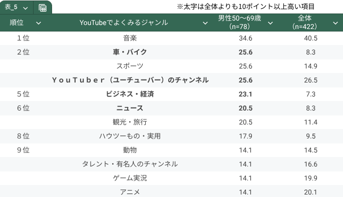 男性50~69歳では、「音楽」34.6%、「車・バイク」「スポーツ」「YouTuberのチャンネル」25.6%が上位に入りました。