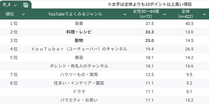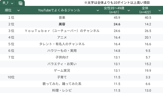 「美容」「ファッション」は調査全体と比較して非常に高く、オシャレに関心のある人が多いようです。また、男性とは異なり、「観光・旅行」といった趣味のジャンルや、「歌ってみた、踊ってみた系」「大食い系」などのジャンルも見られています。