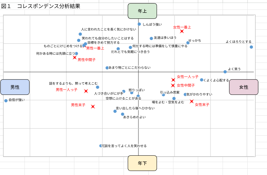 まず各×印について見てみましょう。「女性一番上」は右上のブロックに1つだけ独立して位置しています。「男性一番上」と「男性中間子」は左上、「男性一人っ子」と「男性末子」は左下、「女性一人っ子」と「女性中間子」は中央寄りの右下、少し離れた右下に「女性末子」とあります。「男性一番上」と「男性中間子」、「男性一人っ子」と「男性末子」、「女性一人っ子」「女性中間子」「女性末子」はそれぞれ似ている傾向があると言えそうです。