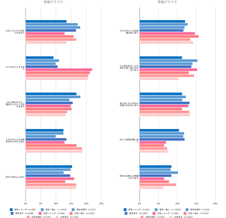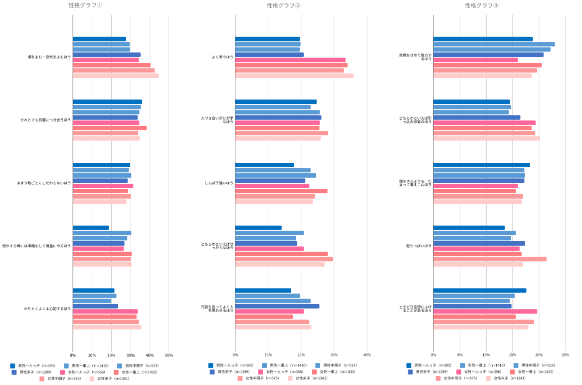 この3属性は傾向が近い結果となり、「引っ込み思案のほう」「場を読む・空気をよむほう」「気が変わりやすいほう」という性格が多いようです。特に、女性中間子は「引っ込み思案」「空気を読む」が強く、女性末子は「気が変わりやすい」「空気を読む」、女性一人っ子は「よく笑うほう」「心配するほう」という性格の傾向が強くなっています。