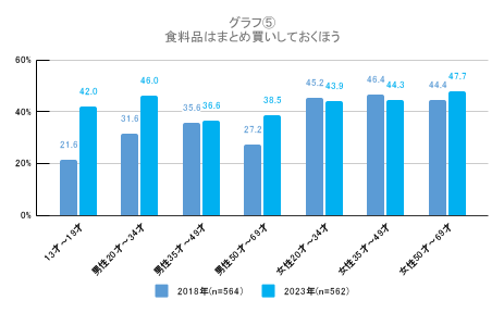 2018年と比較すると、2023年では赤枠部分の「冷凍の素材食品を利用」「冷凍の加工食品を利用」「レトルト食品を利用」「食料品はまとめ買いしておく」が増加しています。