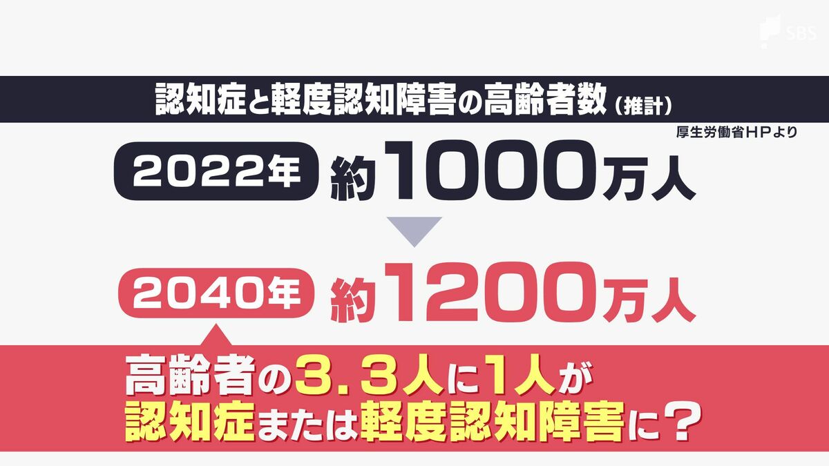 厚生労働省によりますと、2022年の認知症と軽度認知障害の高齢者の推計は合わせて1000万人を超え、2040年には高齢者約3.3人に1人が認知症または予備群になると見込まれています。