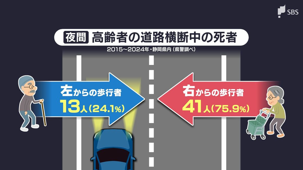 暗くなる時間帯、ドライバーから見て右側から横断してくる歩行者は発見が遅れます。静岡県警によると、過去10年の道路横断中の高齢者の夜間死亡事故では、左からの横断と比べて右から横断する歩行者の死者は約3倍多いということです。