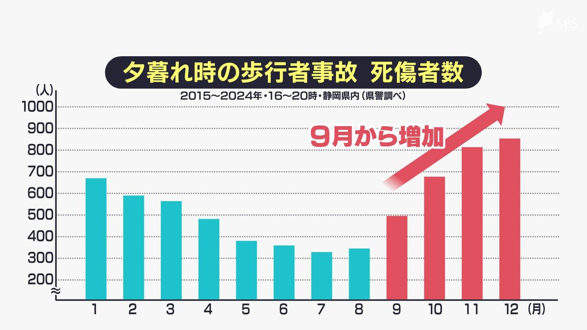 日没が早くなるこれからの時期、夜間の事故を減らそうという狙いです。静岡県警が調査した過去10年間の歩行者の事故件数では、日没が早くなる9月から事故が増加する傾向にあります。