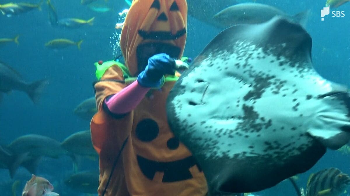 仮装ダイバーが集まってくる魚たちにエサを与える姿はまるで、子どもたちにお菓子を配るハロウィーンのようです。