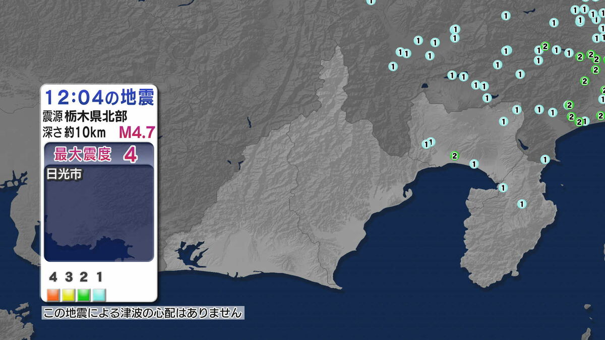 気象庁によりますと、震源は栃木県北部で、震源の深さは10キロ、地震の規模を示すマグニチュードは4・7と推定されています。