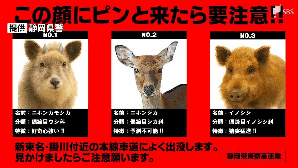 静岡県警によりますと、高速道路で車と動物が接触する事故の統計はとっていないものの、かなりの数が確認されているということです。