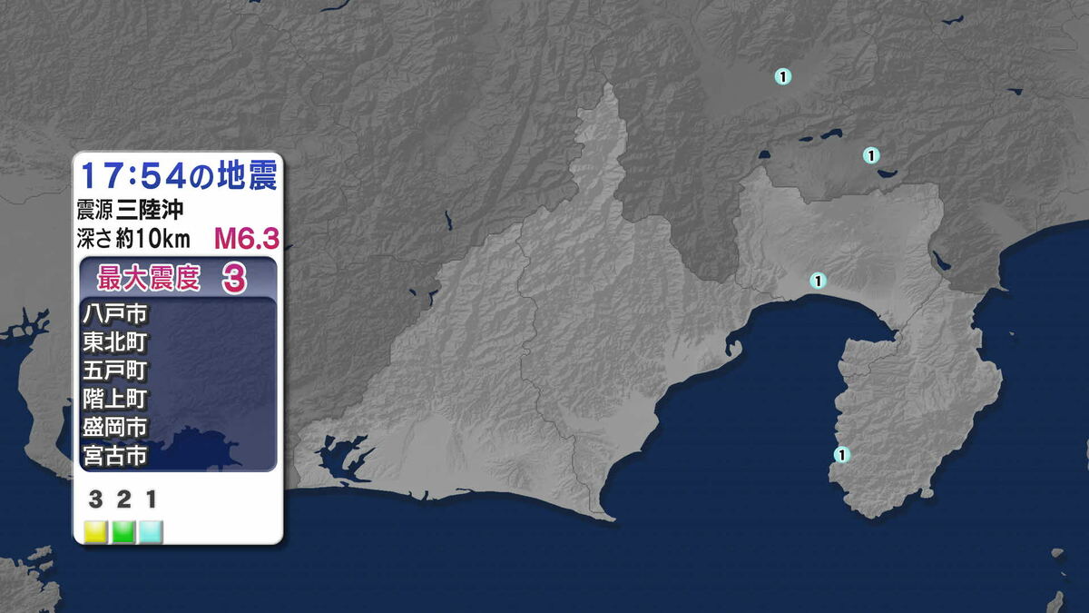 最大震度3を観測したのは、青森県八戸市、東北町、五戸町、階上町、岩手県宮古市、普代村、野田村、盛岡市、八幡平市、滝沢市、紫波町、矢巾町、花巻市、一関市、奥州市、宮城県登米市、栗原市、大崎市、涌谷町、宮城美里町、石巻市、山形県中山町です。