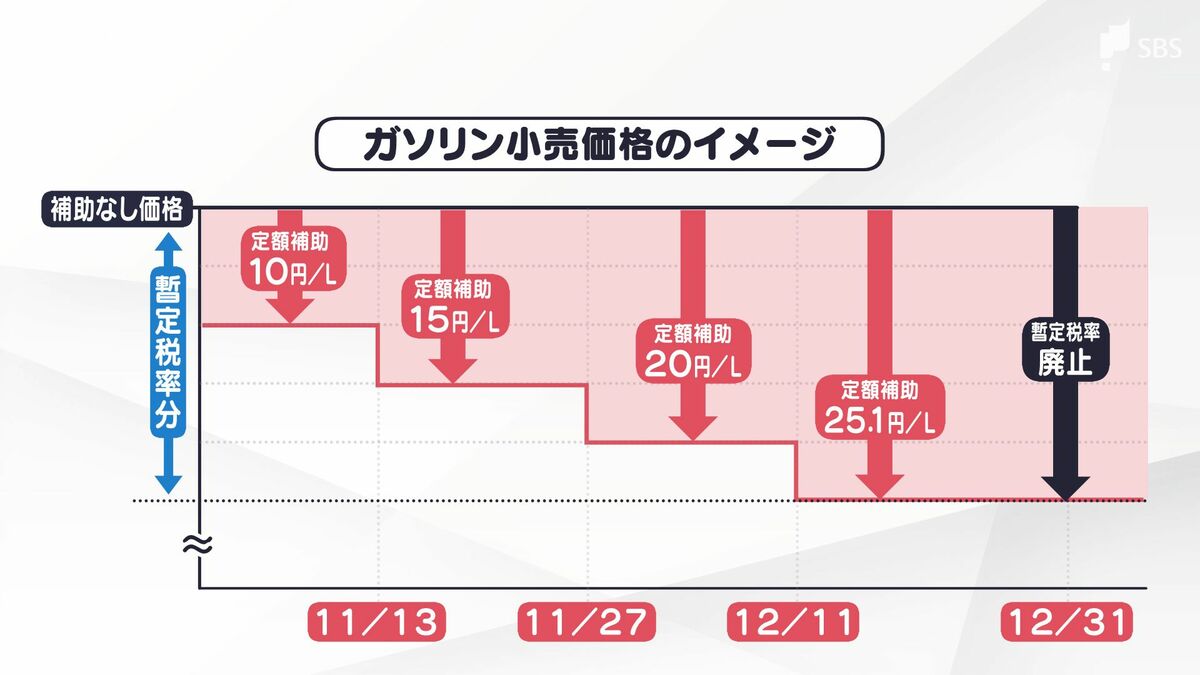 これまで1リットルあたり10円でしたが、13日から15円に増額されました。2025年内の暫定税率の廃止で、急激な価格の変化が起きないよう2週間ごとに5円程度引き上げ、段階的に価格が下がる見込みです。