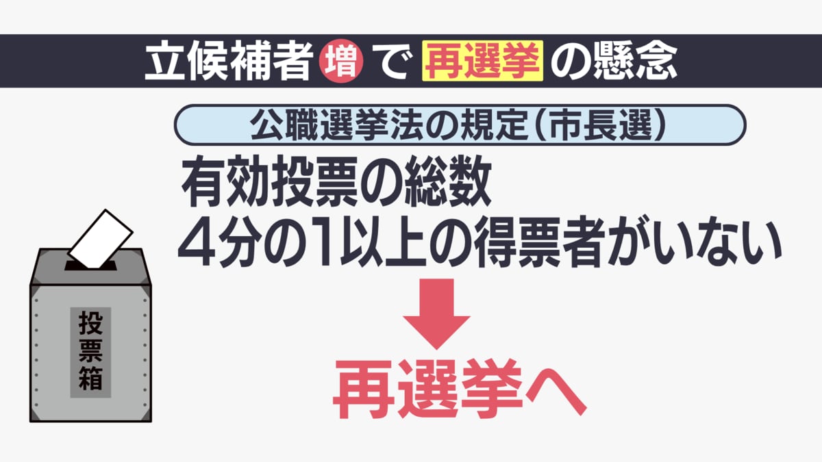 公職選挙法の規定では市長選の場合有効投票の総数の4分の1以上の得票者がいない場合、再選挙となります。