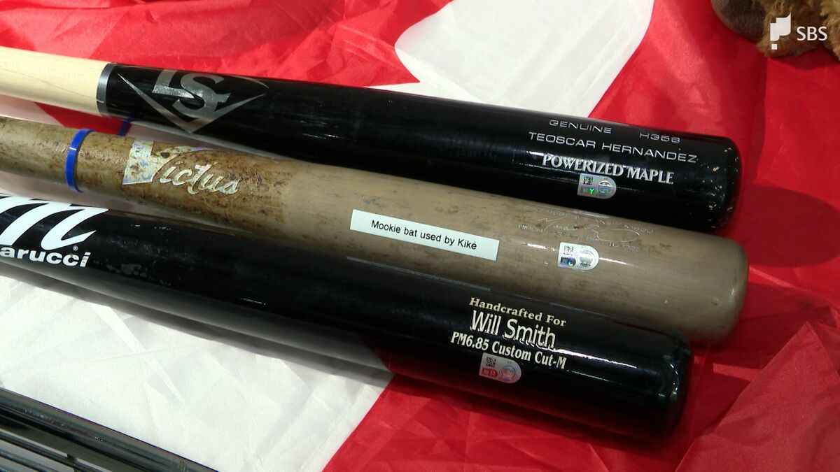ユニフォームやキャップが売られているほか、ドジャースの3選手が実際に使ったバットも展示されています。