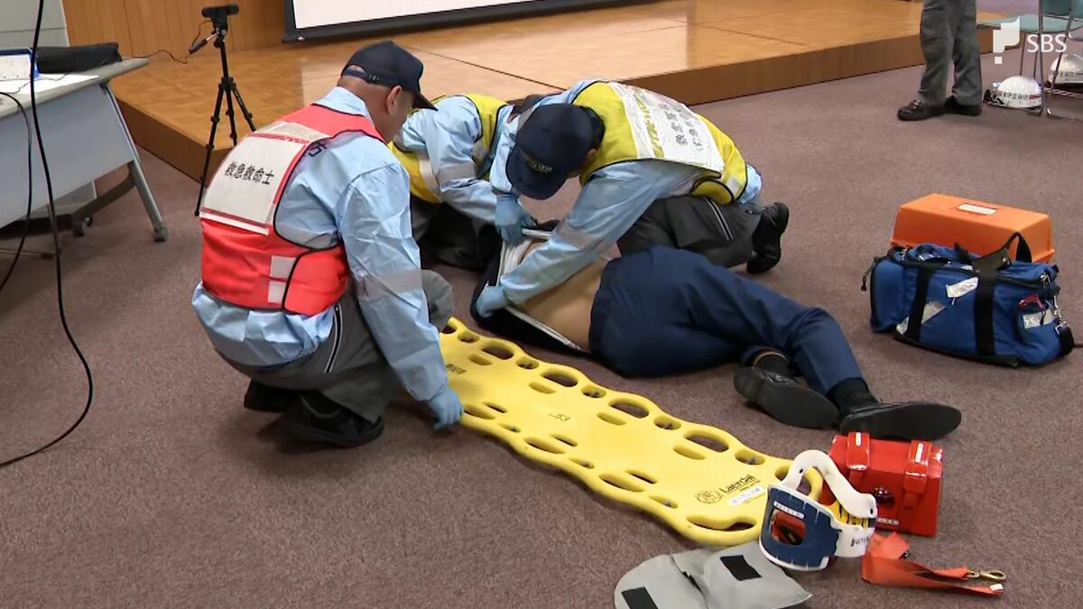 訓練では「交通事故に遭い苦しんでいる人」など、様々な119番通報の課題がその場で与えられ、隊員たちは事故状況や容体を聞き取りながら救命処置をし、本番さながらの対応を繰り広げました。