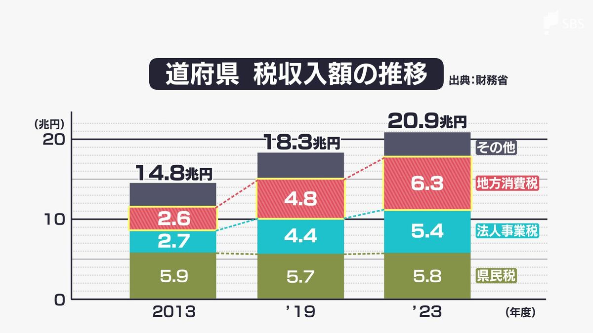 「都道府県税の税収のもとになる税源について、従来は、ものづくりとか製造とかの付加価値の税収を主としていたものが、消費税に移行している。製造業に頼った法人事業税に頼っているところは厳しくて、で、人口がある程度いて、しかもサービス業の盛んな都市部においては地方消費税が税率も上がったりして豊かになっている」