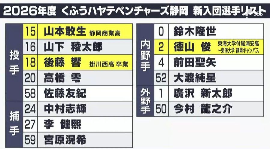 静岡県勢からは、静岡商業高校のエース山本敢生投手をはじめ3人が名を連ねています。球団によりますと、コーチ人事や過去に12球団に所属していた選手らの獲得については、現在調整中ということです。