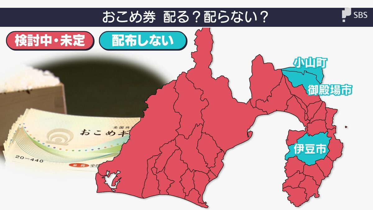SBSでは静岡県内のすべての自治体に緊急アンケートを実施し、おこめ券を配る予定があるのかどうか聞きました。35市町のうち32市町で検討中、もしくは未定となっていて、残りの3市町は配布しないという結果になりました。(12月3日時点、SBS調べ)