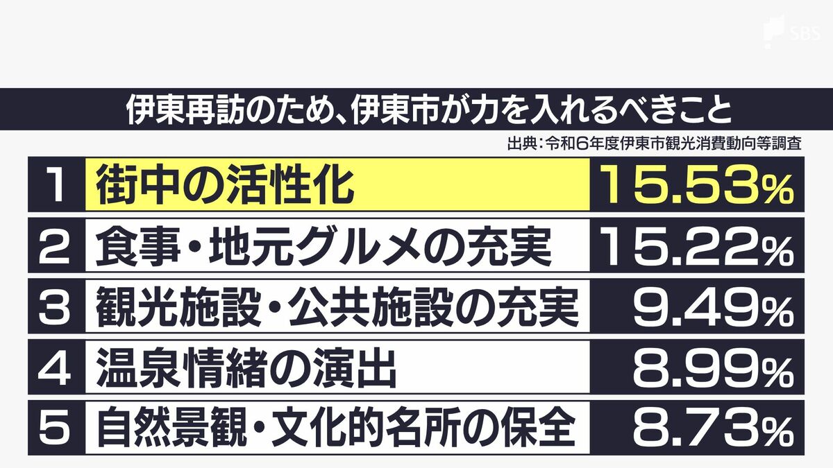 伊東市が観光客を対象に毎年行っているアンケートでは、再び伊東に来てもらうために力を入れるべきことについて、「街中の活性化」が最も高くなっており、市街地の魅力づくりが急務となっていることが分かります。