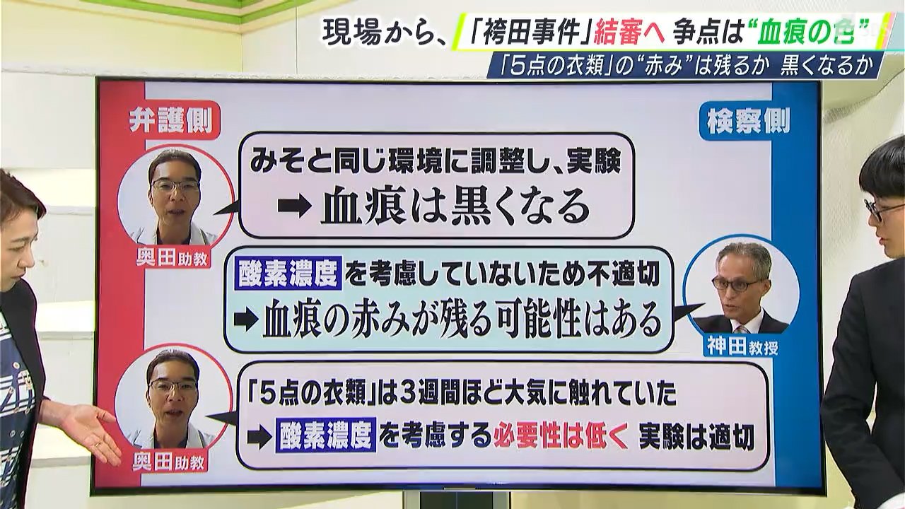 神田教授は、血痕の赤みが残るかどうかを確かめるためには、pHと塩分濃度だけでなく、「酸素濃度」を考慮する必要があると指摘。1年2か月間、「5点の衣類」があったとされるみそタンクの底は、酸素濃度が著しく低く、それにより血液の赤みが残る可能性はあると主張します。