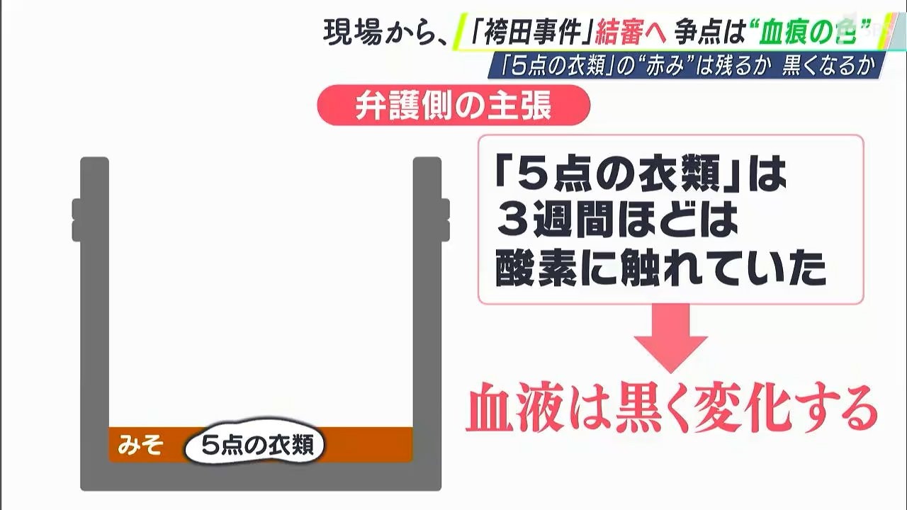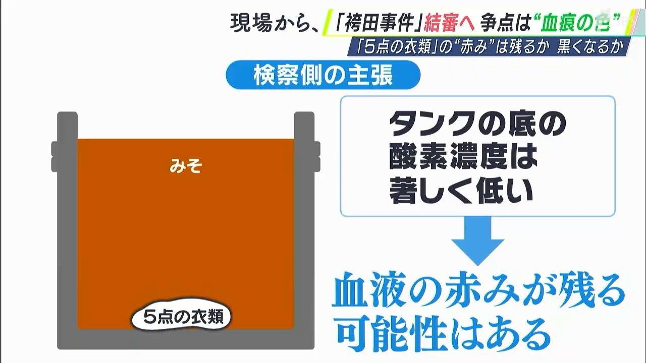 弁護側は、みそ会社の従業員の供述調書に基づき、事件発生から3週間ほどはタンクの中のみそは少なく、「5点の衣類」が酸素に触れる時間は十分にあったなどと主張しました。