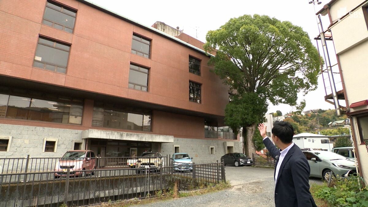 「伊東市にある伊東図書館です。図書館が入る建物の上を見てみますと、外壁の一部がはがれていて、老朽化が目立っています」