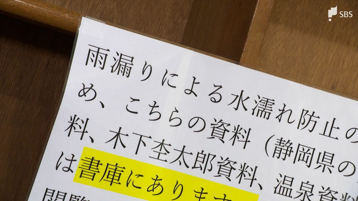 竣工から45年。建物の劣化が進む中で天井のいたる場所から雨漏りがしています。応急処置でしのいでいるものの、雨漏りがひどい部屋にある本は、地下にある書庫に移動せざるを得ない状況だといいます。