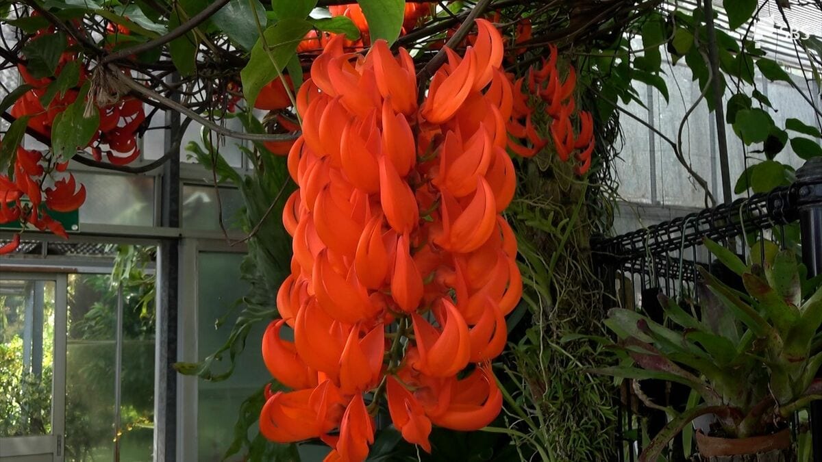 オウムカズラはツル性植物の和名で、オレンジ色の花がオウムの羽を連想させることに由来しています。20年前に寄贈されて以来、ツルは20メートル以上になり、この冬は80房以上のオレンジ色の花が満開になっています。
