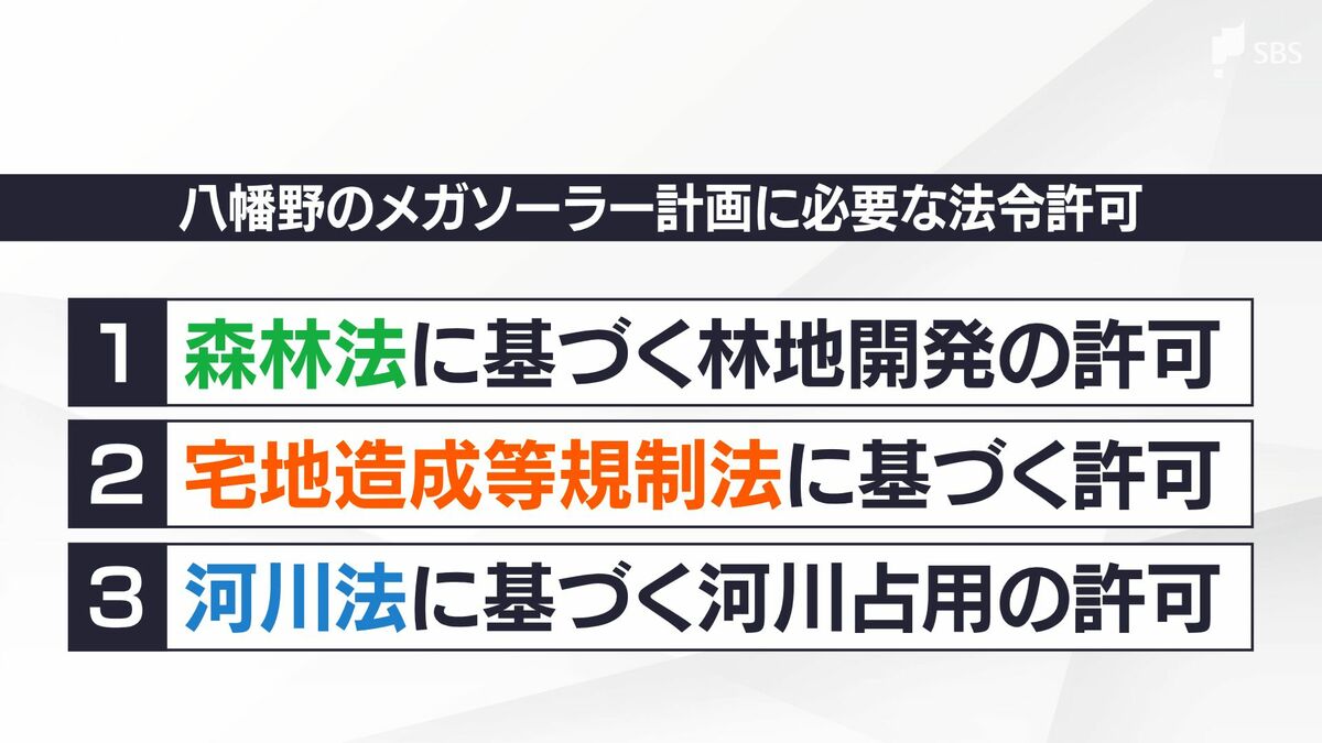 八幡野地区のメガソーラー計画の場合、「林地開発の許可」「宅地造成の許可」「河川占用の許可」の3つが必要になっています。