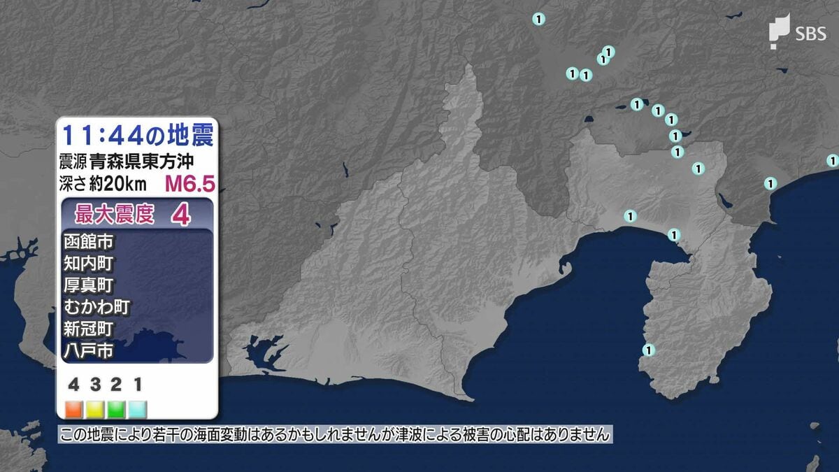 気象庁によりますと、震源地は青森県東方沖で、震源の深さ約20km、地震の規模を示すマグニチュードは6.5と推定されています。