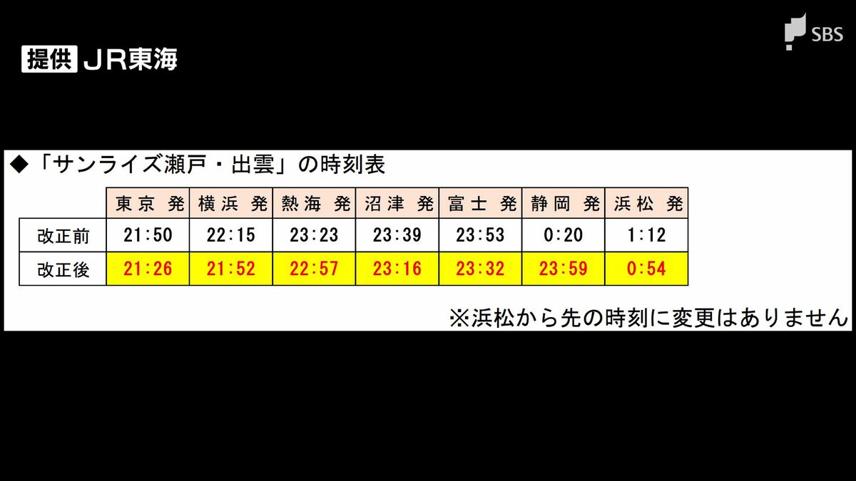 東京駅から岡山駅を経由して高松駅と出雲市駅を結ぶ寝台特急「サンライズ瀬戸・出雲」でもダイヤ改正が行われ、下り列車の東京駅~浜松駅の出発時刻が繰り上げられます。東京駅の出発時刻が現在の午後9時50分から午後9時26分になるということです。静岡県内の停車駅でも、熱海駅で26分、沼津駅で23分、富士駅で21分、静岡駅で21分、浜松駅で18分、それぞれ発車時刻が繰り上げられます。なお、浜松駅以降の時刻に変更はありません。