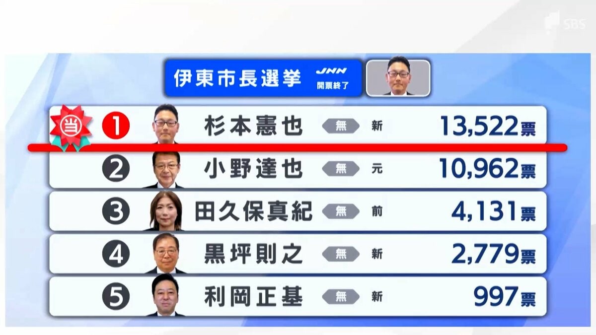 過去最多の9人が立候補した静岡県の伊東市長選挙は、元市議の新人で国民民主党県連が推薦した杉本憲也氏(43)が、元市長で自民党県連推薦の小野達也氏らを破り、初当選を果たしました。