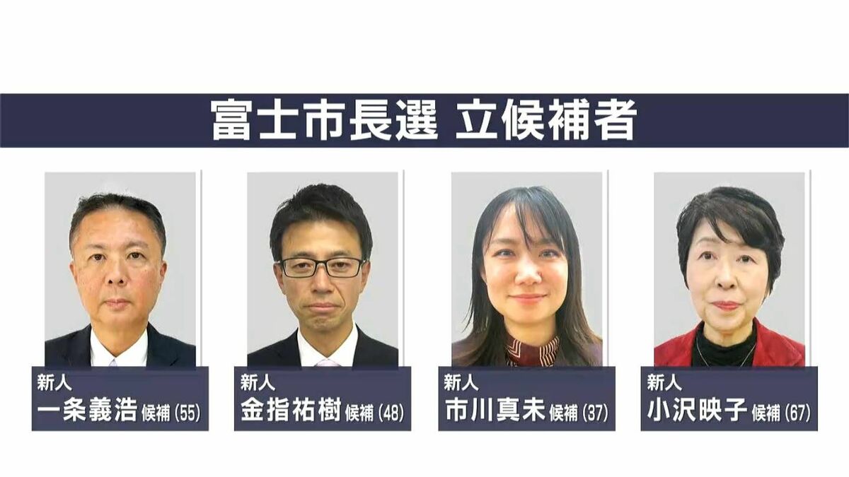 富士市長選に立候補したのは、届け出順にいずれも無所属・新人で元富士市議会議員の一条義浩候補(55)、元中学校教諭の金指祐樹候補(48)、元富士市議会議員の市川真未候補(37)、元富士市議会議員の小沢映子候補(67)の4人です。