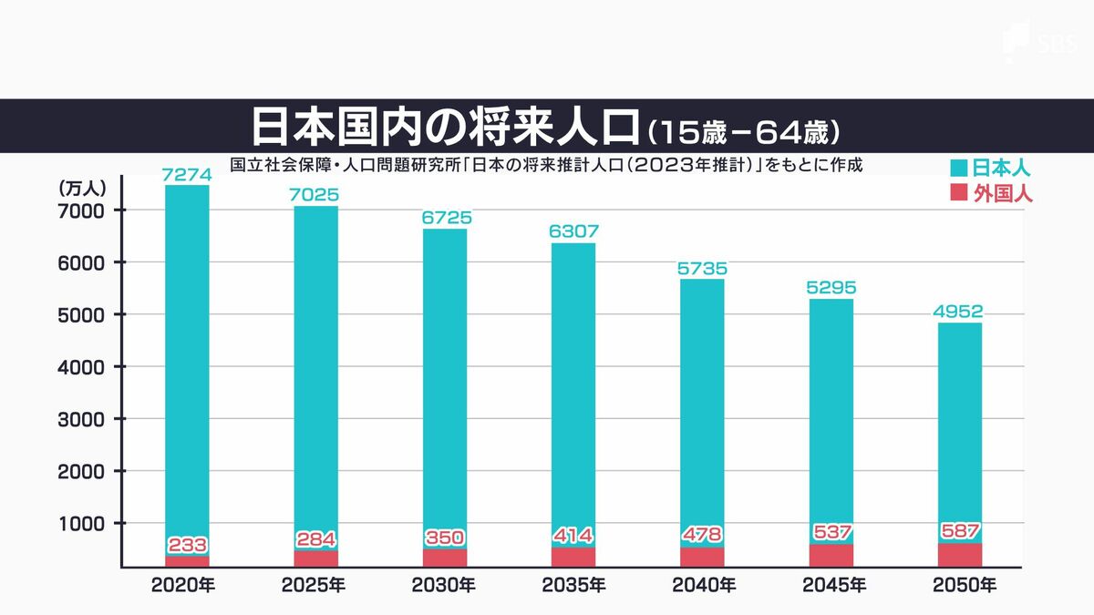 深刻な少子高齢化の波。日本人の働き盛りの人口は年々減少し、2050年には5000万人を切るとみられています。一方で、国内に住む同年代の外国人の人口は年々増え、2050年には日本人の10%を超える587万人となる推計です。