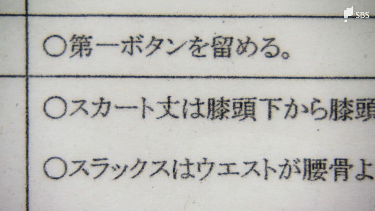 「校内では服装について書かれた校則が掲示されています。項目はずらりと並んでいて、スカートは膝頭下から膝頭中心までと細かく書かれています」