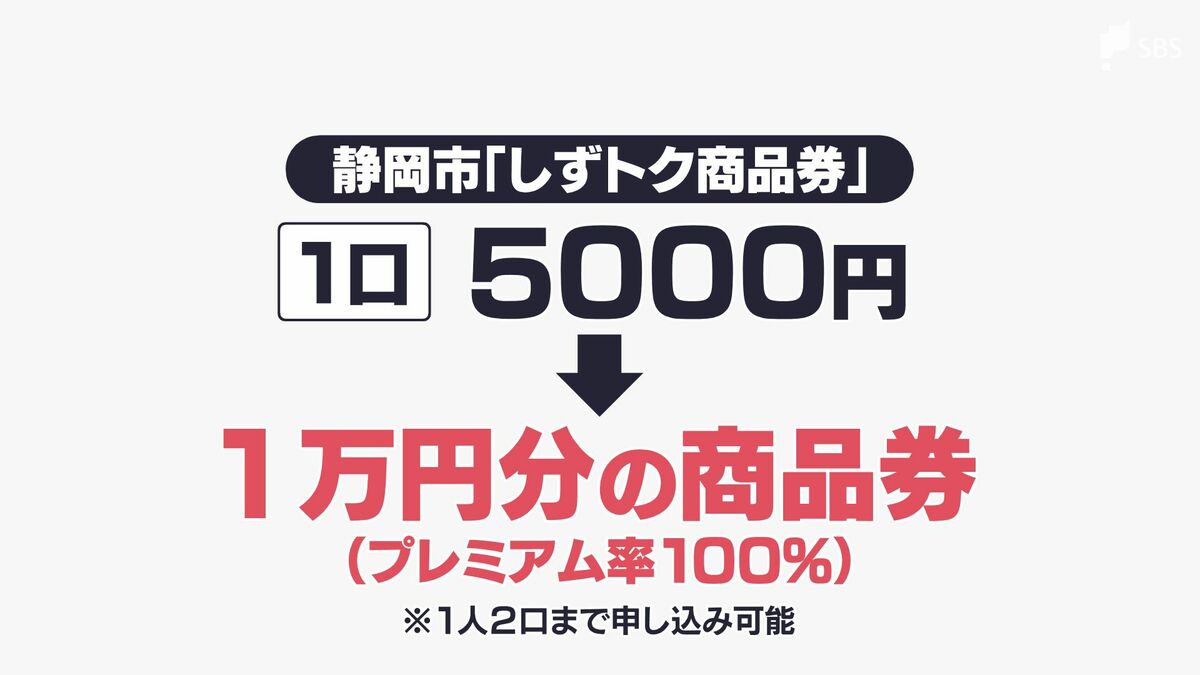 今回発行される「しずトク商品券」は、1口5000円でプレミアム率100%が上乗せし1万円分の買い物をすることができるというもので、1人2口まで申込みが可能です。