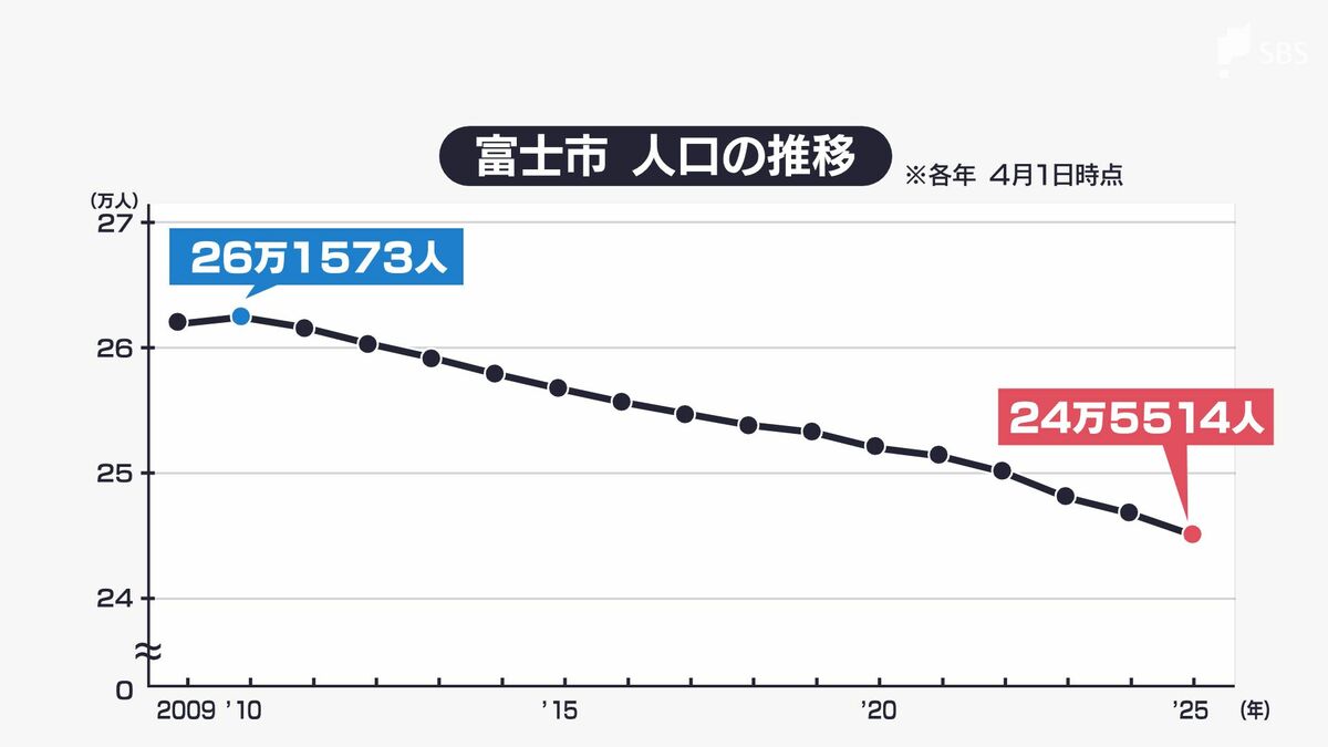 新人4人で争う選挙戦の争点の一つに挙げられるのが「人口減少対策」。静岡県内では3番目に人口が多い富士市ですが、2010年の26万人あまりをピークに緩やかに減り続け、2025年は約24万5000人となっています。