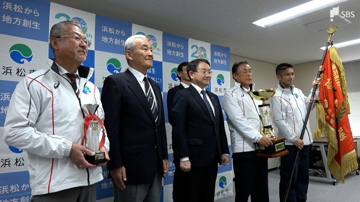 浜松市役所では12月18日午後に贈呈式が行われ、大会事務局から浜松市の中野祐介市長に優勝ペナントが手渡されました。浜松勢の優勝は今回で17回目となります。