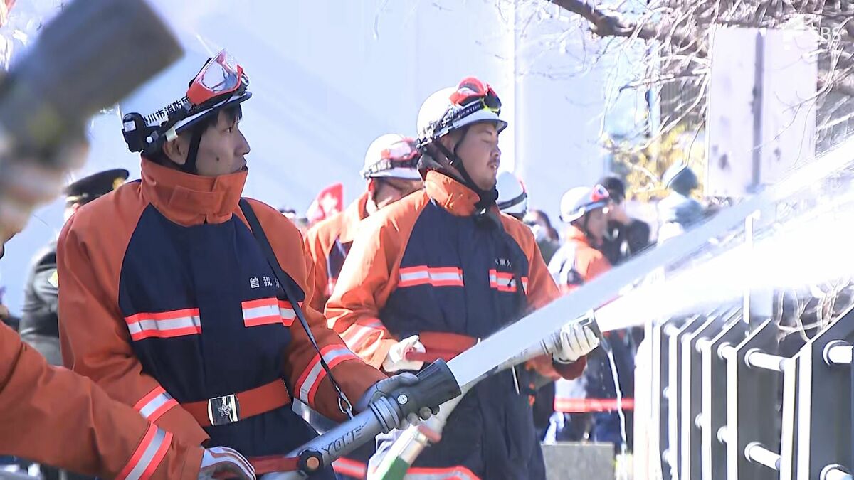 静岡県掛川市では1月4日、新春恒例の消防出初式が開かれ、呼び物の掛川城にむけた一斉放水などが披露されました。