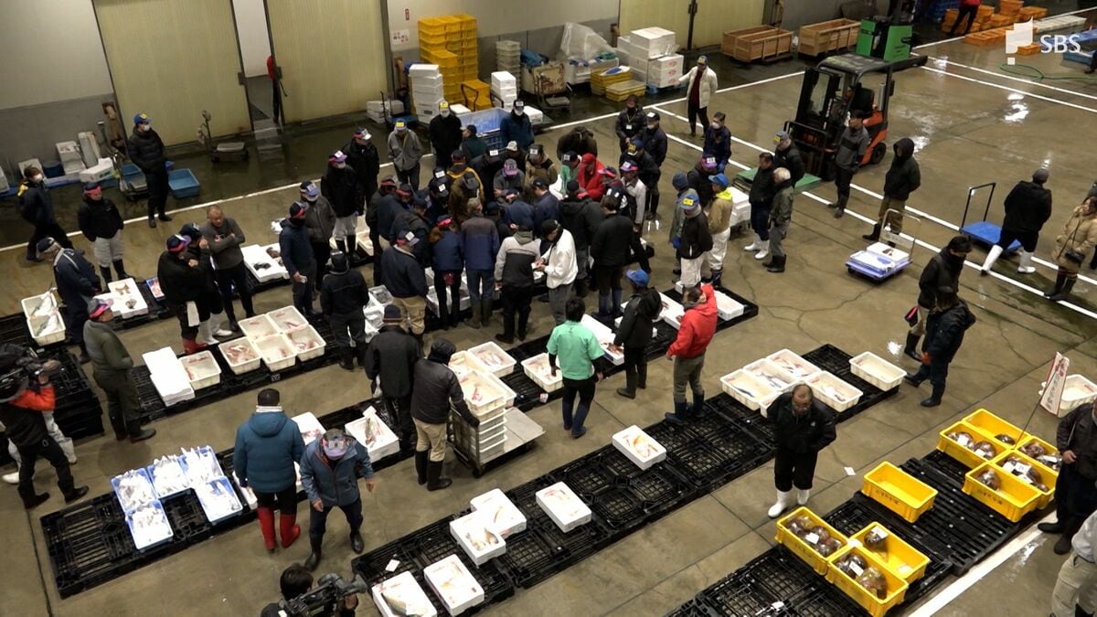 1月5日朝の沼津魚市場の初競り、目玉は青森県大間産などずらりと並んだマグロです。
