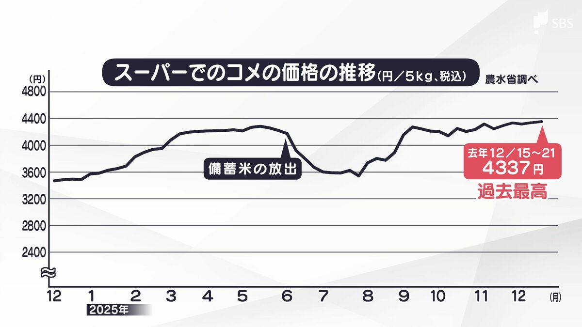 2025年、大きく揺れ動いたコメの価格。6月には政府が備蓄米を放出したため、価格は一時落ち着きました。しかし、再び上昇に転じ、高値で推移。2025年末には過去最高値を更新しました。