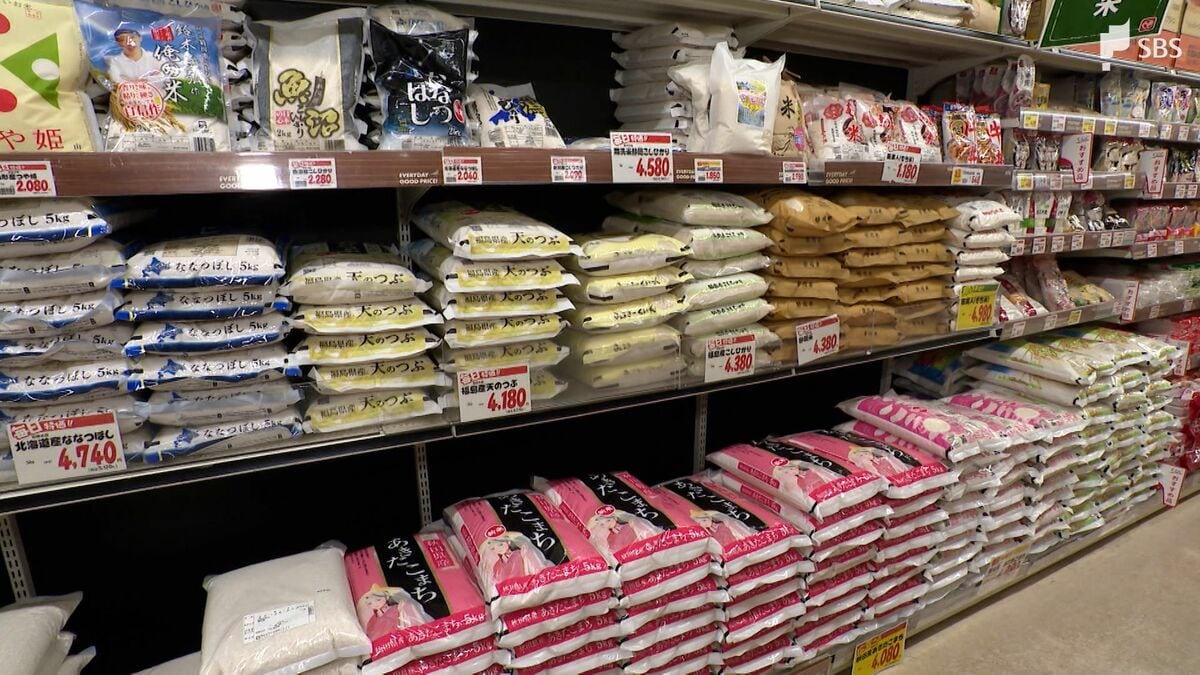 「静岡市内のスーパーです。米の陳列棚には多くの商品が並んでいます。価格をみると一部は3000円台のものもありますが、4000円台の商品が多い印象です」
